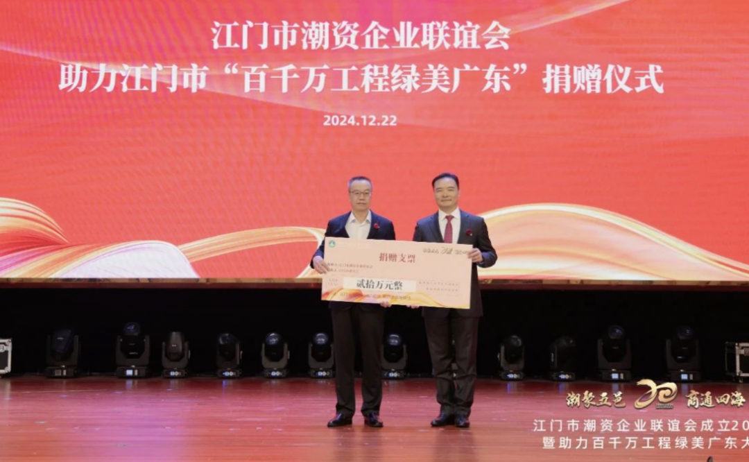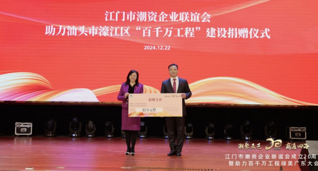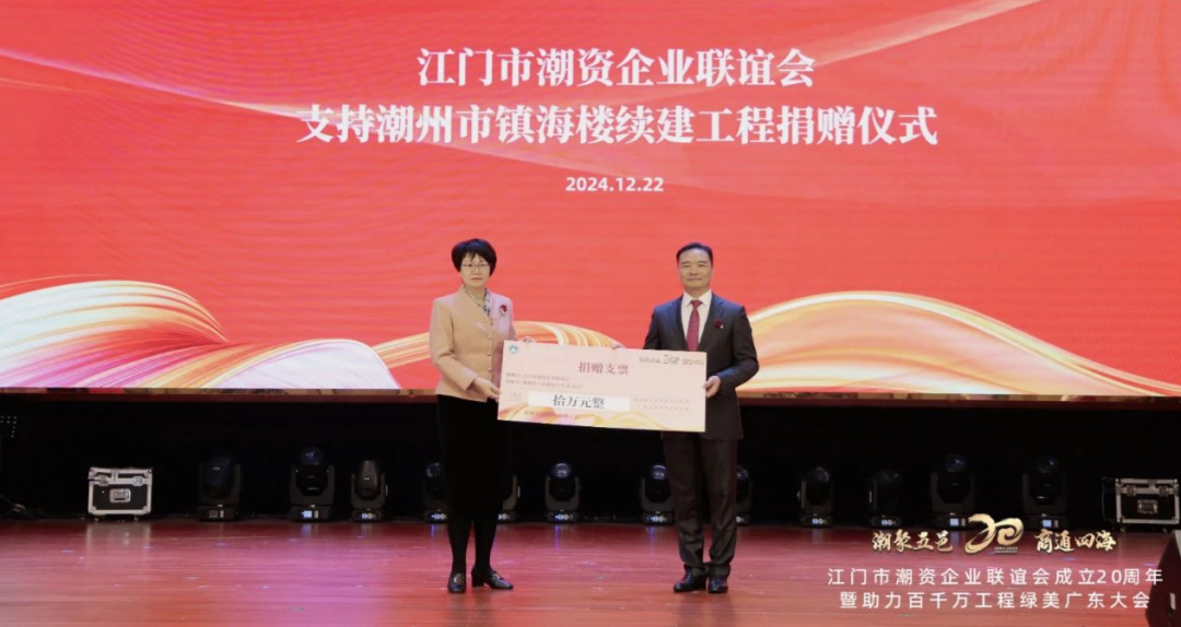На церемонии дарения Ассоциация предприятий, финансируемая Цзянмэнь Чаочжоу, продемонстрировала свою социальную ответственность и благотворительный дух посредством конкретных действий. Он пожертвовал 200 000 юаней на инициативу «Сто, тысячи и десять тысяч проектов» «Зеленая и красивая Гуандун», способствуя улучшению экологической среды и качества жизни жителей провинции Гуандун. Кроме того, он пожертвовал 100 000 юаней на продолжение проекта Башни Чжэньхай в Чаочжоу и еще 100 000 юаней на проекты «Сто, тысячи и десять тысяч» в районе Хаоцзян.