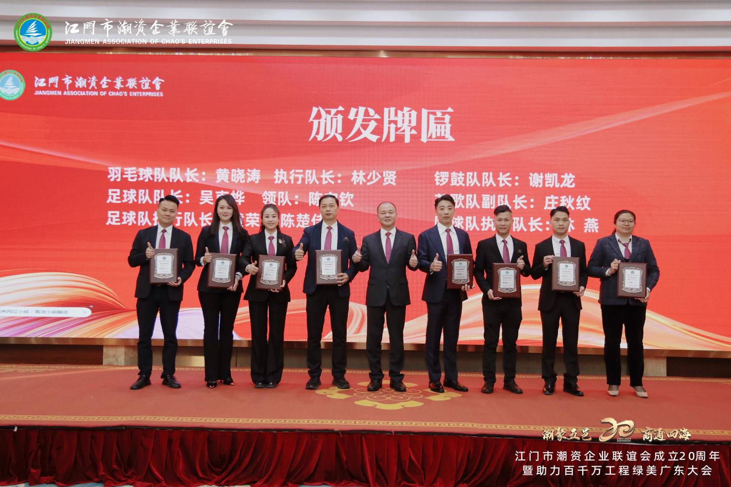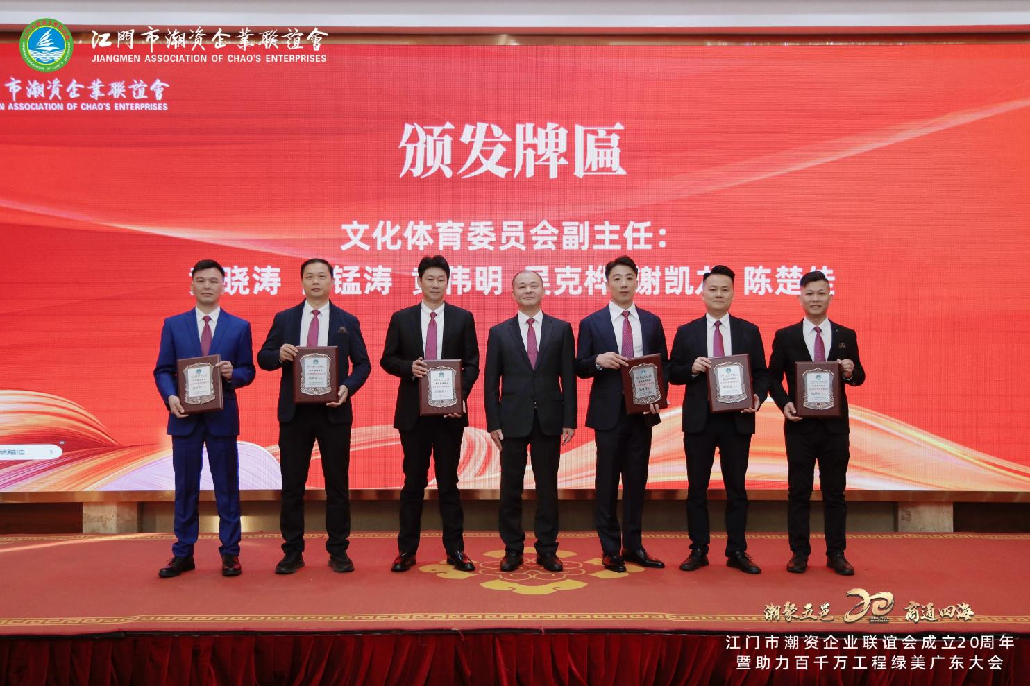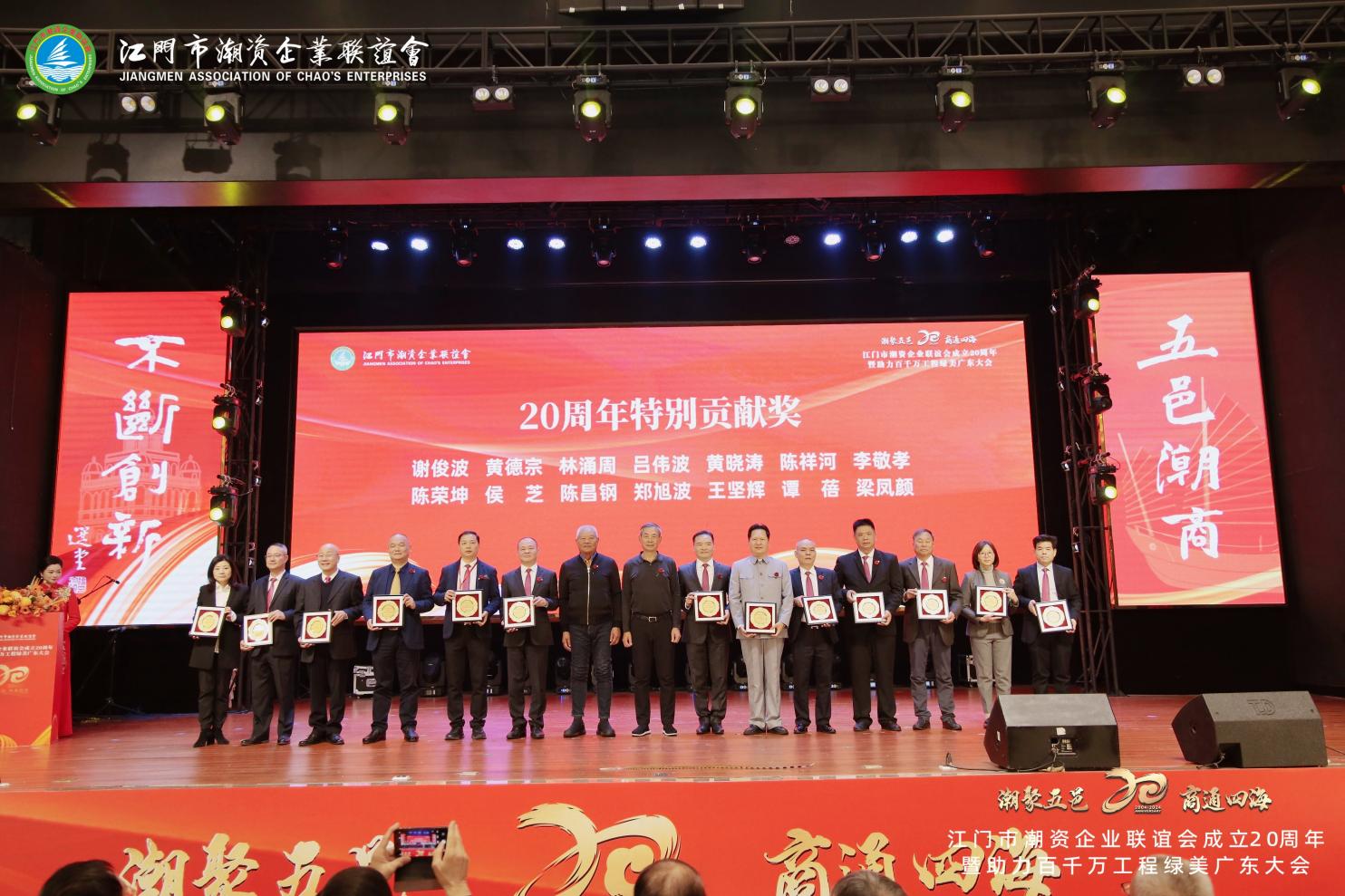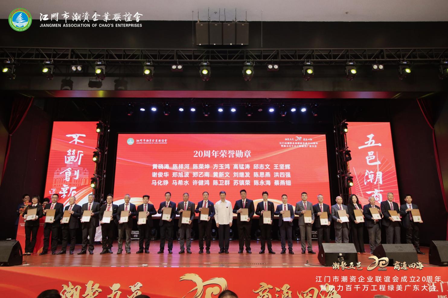 Чжао Цзияо, бывший председатель муниципального комитета Цзянмэнь Народного политического консультативного совета Китая, и Лян Цинчжао, бывший исполнительный заместитель директора Постоянного комитета Муниципального народного конгресса Цзянмэнь, вручили «Награду за особый вклад в честь 20-летия». вице-президенту Хуан Сяотао и другим выдающимся членам ассоциации.