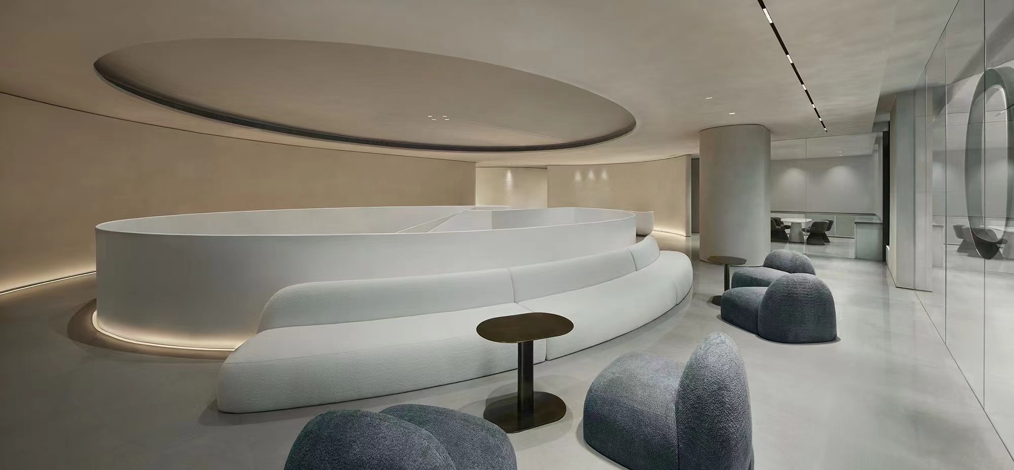 В пространстве постарайтесь описать и изобразить в дизайне нематериальные вещи, используя материальные формы, чтобы раскрыть культурное мышление на духовном уровне, формируя нематериальную атмосферу, воздействующую на ваше осязание, обоняние и слух.Окружение — интересная форма пространства, которая не только определяет внешний мир, но и конструирует внутренний мир.Он стирает границу между медицинским пространством и пациентами, и это спокойствие пронизывает каждую деталь изнутри, пробуждая наше осознание пространства.В зоне ожидания мы выбрали мягкий диваны с мягкими формами, чтобы удовлетворить потребности пользователей в комфорте и добавить более нежную атмосферу.Мало того, тщательно подобранное сочетание синего и белого делает всю зону ожидания более свежей и яркой, привнося нотку жизненной энергии в спокойное пространство.Столкновение металла и ткани разбавляет смысл процесса сдержанными эмоциями и богато выражением духовного и материального преображения.